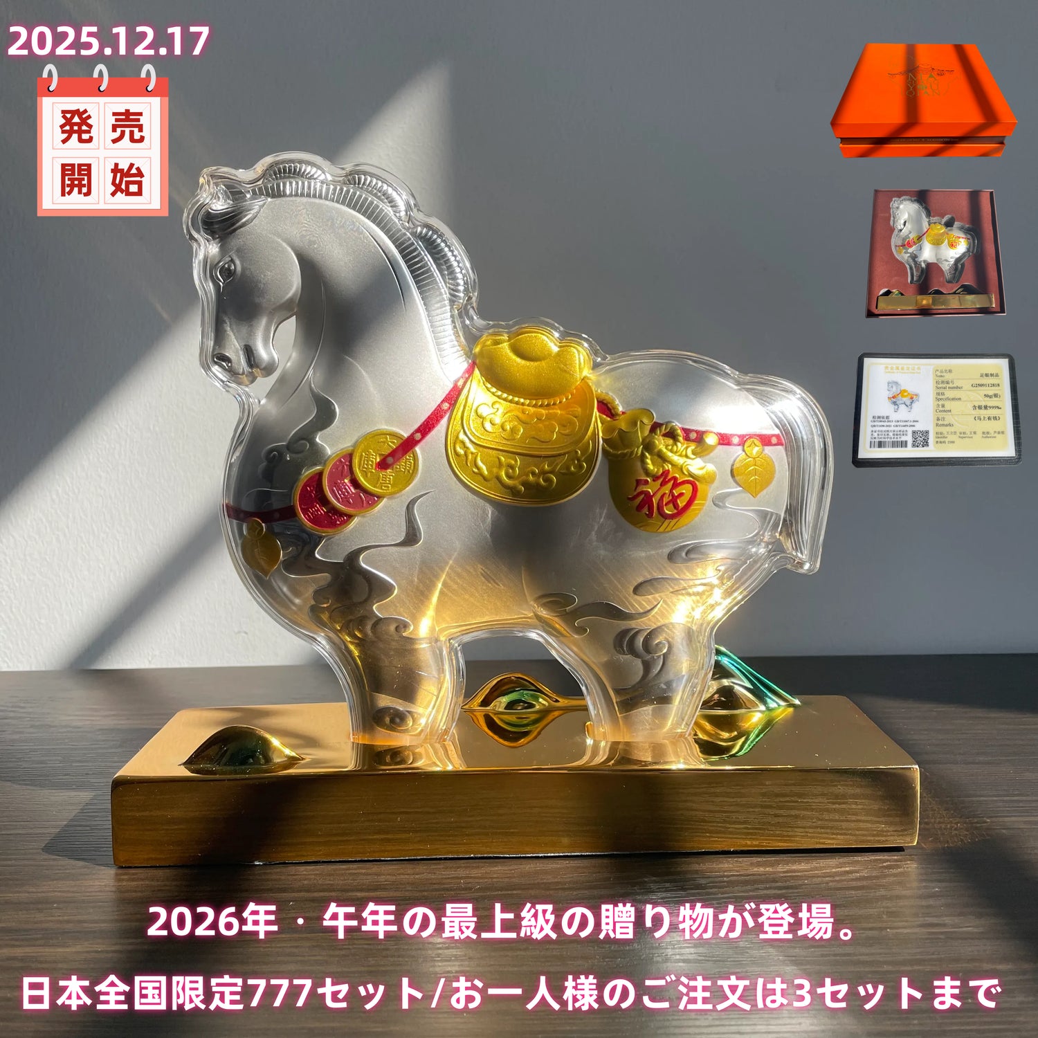 熟練の職人が一点一点心を込めて作り上げた999純銀の「開運駿馬」置物。勝利と飛躍のシンボルである「馬」が力強く前進する姿は、「成功への速やかな道」と「財運の躍動」を象徴し、最強の風水メッセージを体現しています。ビジネスシーンの成功祈願、開業祝い、大切な方への贈り物として、比類なき品格と願いを贈ります。