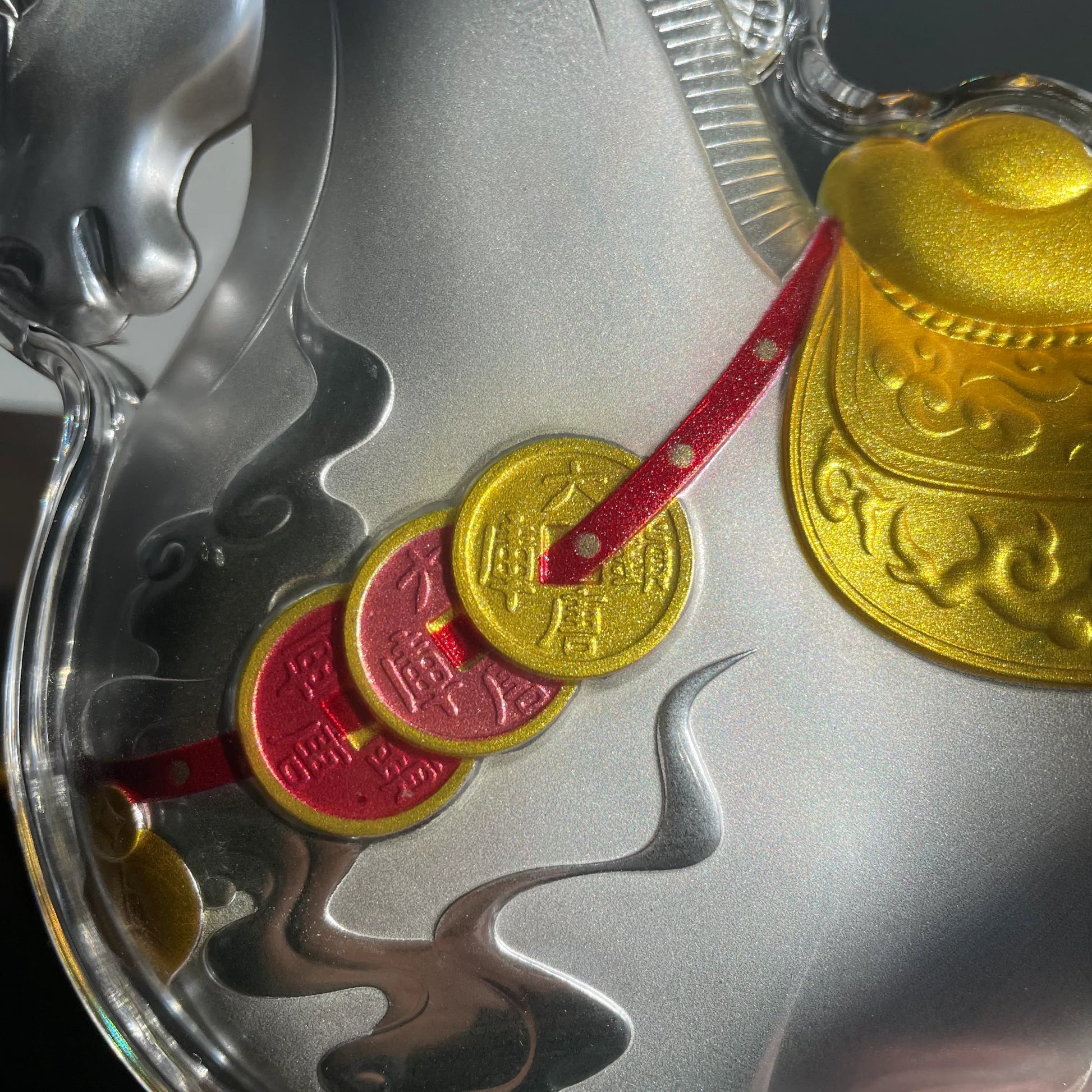 - 精密な仕様:サイズは 高さ19cm × 幅19cm × 奥行5cm。純銀部分の重量は 50g です。大胆でダイナミックな造形。机や棚、玄関に置けば、空間全体の格を一瞬で引き上げます。